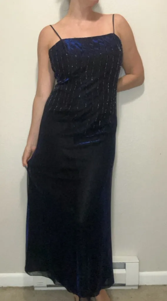 Stunning vintage Betsy & Adam by Jaslene formal dress featuring a timeless 90s/early-00s silhouette. Tagged a 12P, but fits like a modern size 6 (see measurements below). This elegant piece has a slinky, minimalist slip-dress shape with thin spaghetti straps, a straight neckline, and a floor-length maxi hem. The navy fabric is enhanced with vertical beaded detailing that adds subtle sparkle and elongation. Perfect for holiday parties, weddings, formal events, prom, cocktail nights, or vintage collectors.