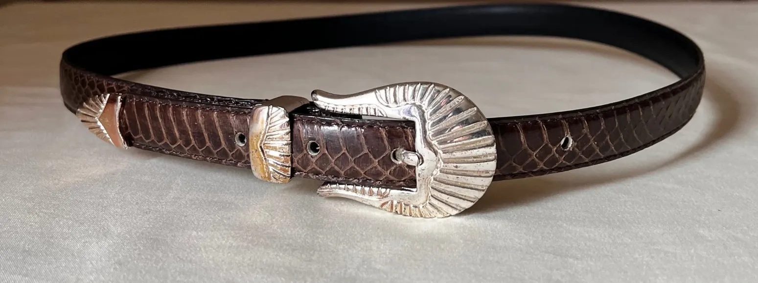 Slim vintage brown snakeskin leather belt with an engraved silver tone western buckle, keeper, and t... Show more
