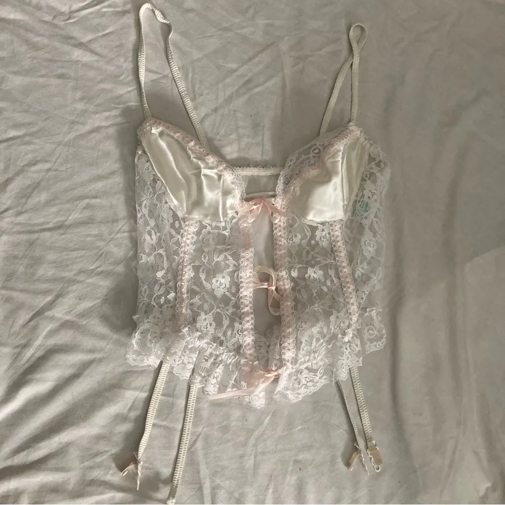 Super sexy coquette corset with front ties. Does have elastic strands with attachments for stockings... Show more