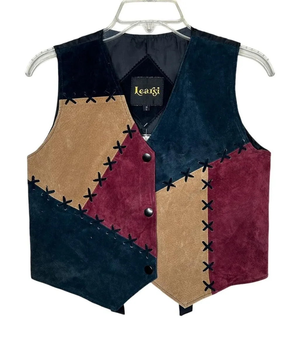 True vintage suede Leather patchwork vest with suede detailing, featuring a multicoloured design #re... Show more