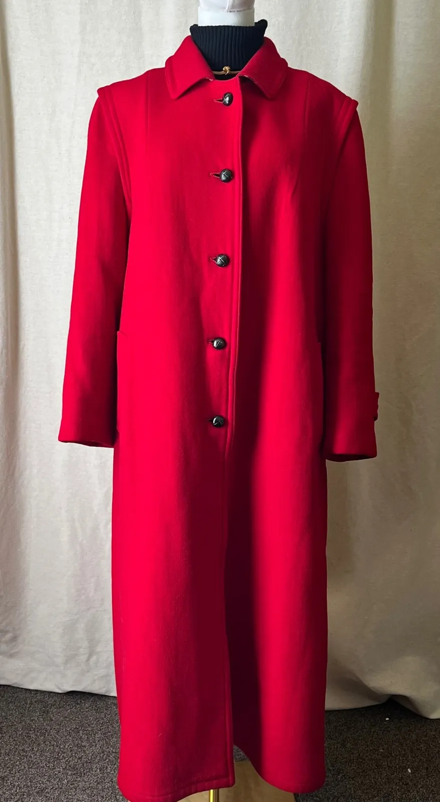 // Please check measurements before purchasing — vintage sizing varies. Striking vintage Austrian loden coat in a bold true red with classic tailored lines. Features traditional underarm cutouts for ease of movement, black button front, and a beautiful plaid interior panel detail. Structured yet wearable, this is a statement winter coat with heritage construction and timeless appeal. ERA: Mid Century MADE IN: Austria DESIGNER: Salko Salzburg TAGGED SIZE: Not listed (fits approx. L/XL – see measurements) MATERIAL: Loden pure wool CARE: Dry clean CONDITION: Very good vintage condition FLAWS: None noted MEASUREMENTS (approx.) Pit to Pit: 23" Waist: 24" Length: 50" Shoulder to shoulder: 19" Sleeve length: 23" (X097) Vintage red wool coat, Austrian loden coat, Salko Salzburg coat, long wool winter coat, statement vintage outerwear, European heritage coat, classic tailored wool coat, bold red coat vintage