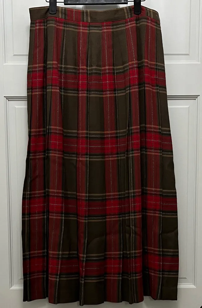 Elegant plaid skirt featuring red and brown tones. Ideal for versatile styling. Made in USA Note... Show more