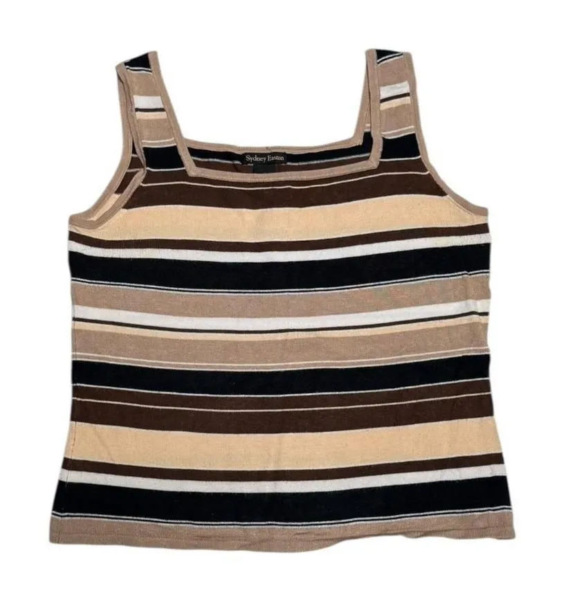 Cream & brown striped Sydney Easton tight knit tank top. Medium. Gently worn. No flaws. Soft. Armpit to armpit 17" flat unstretched. Length 21". #y2kfashion #squareneck #stripedtop