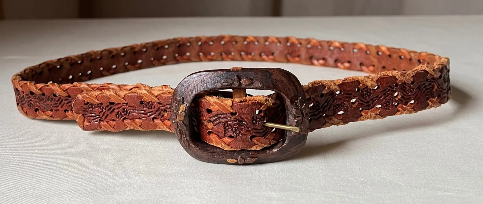 Handcrafted vintage leather belt featuring intricate tooled floral detailing with braided leather ed... Show more