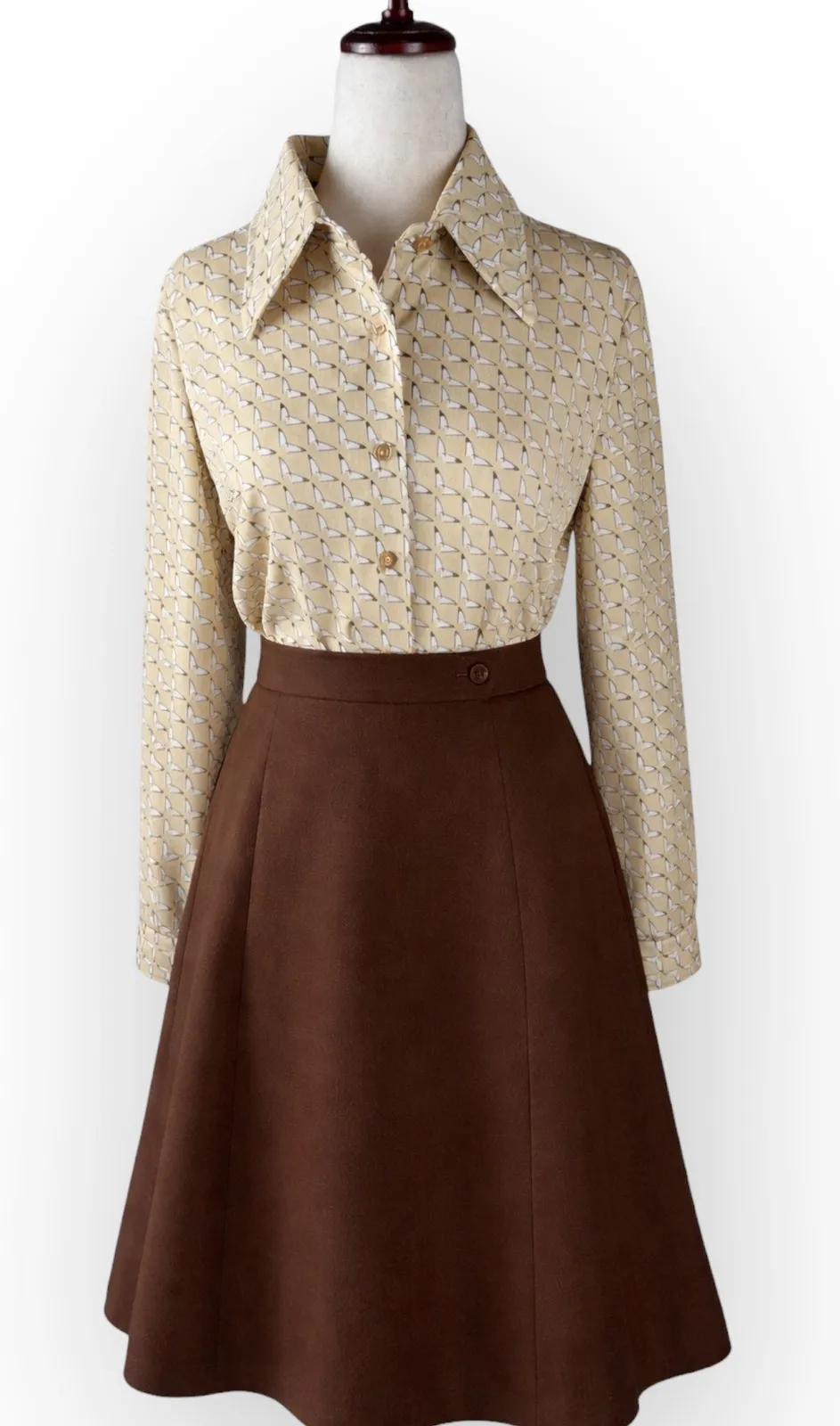 Vintage Devon button front shirt in a tan base with an allover sailboat print and classic pointed co... Show more