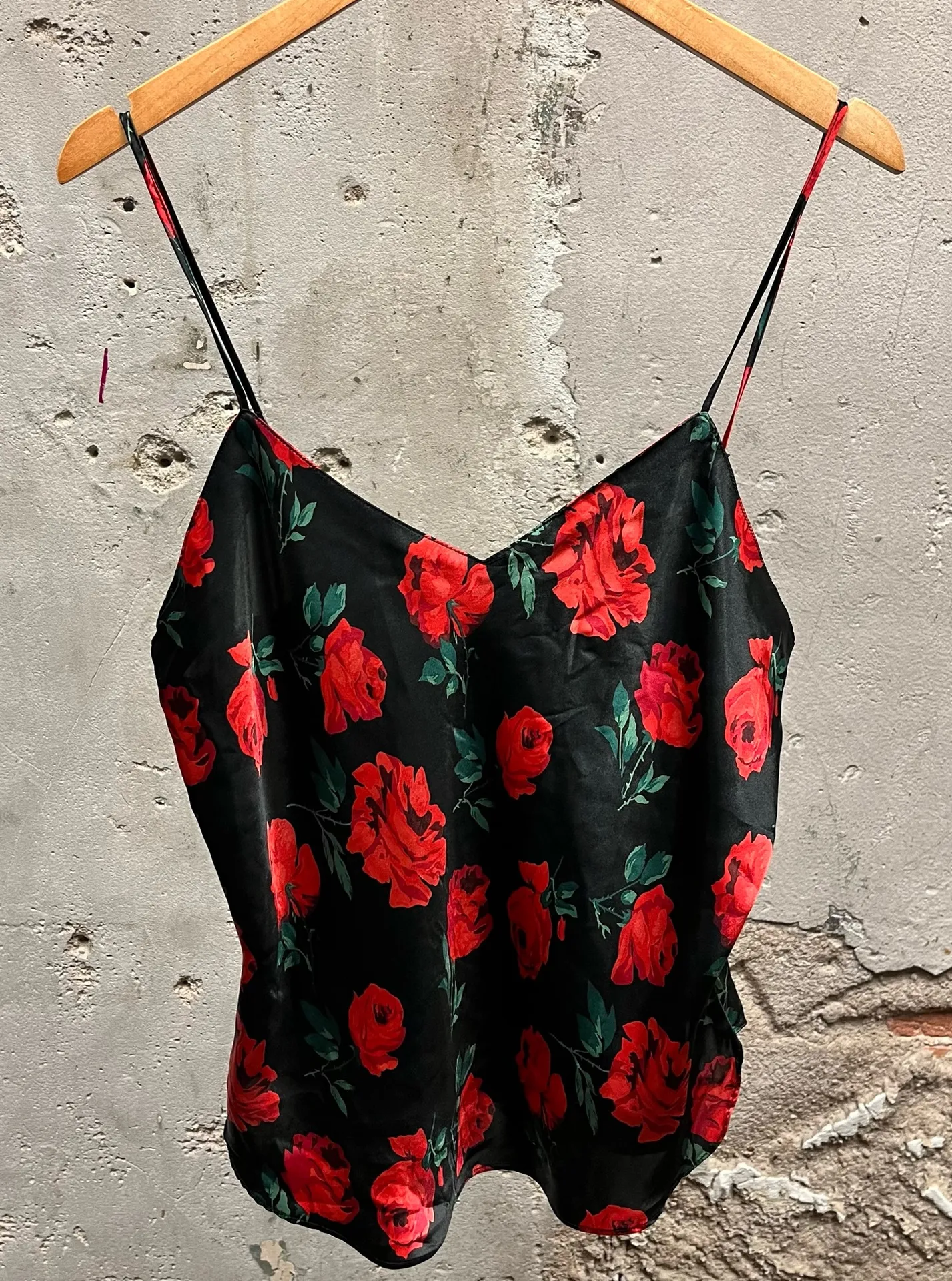 In great condition! Black with a red rose print all over. Lightweight silky chiffon material. Adjustable spaghetti strap upper. Slight v-neck neckline. Gently used! No rips, stains, or holes! Size XL. Pit to Pit: 19.5in Shoulder to Hem: 24in