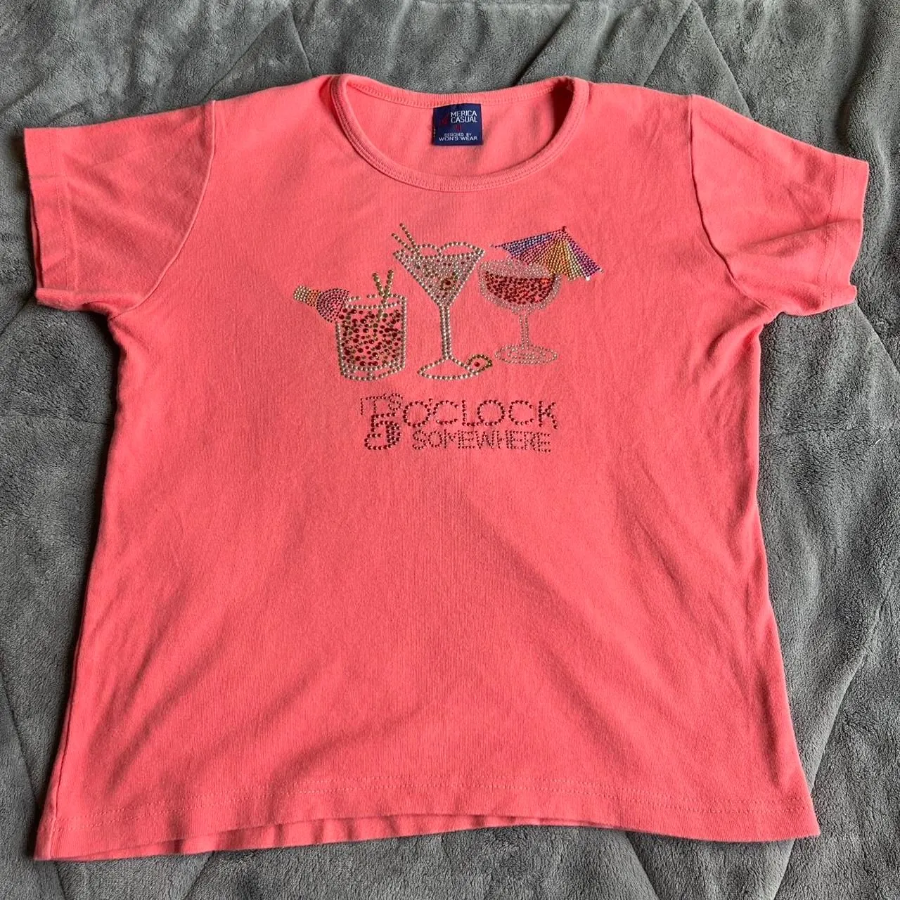 Vintage Y2K “it’s 5 o’clock somewhere” rhinestone bedazzled tshirt salmon/coral color size medium... Show more