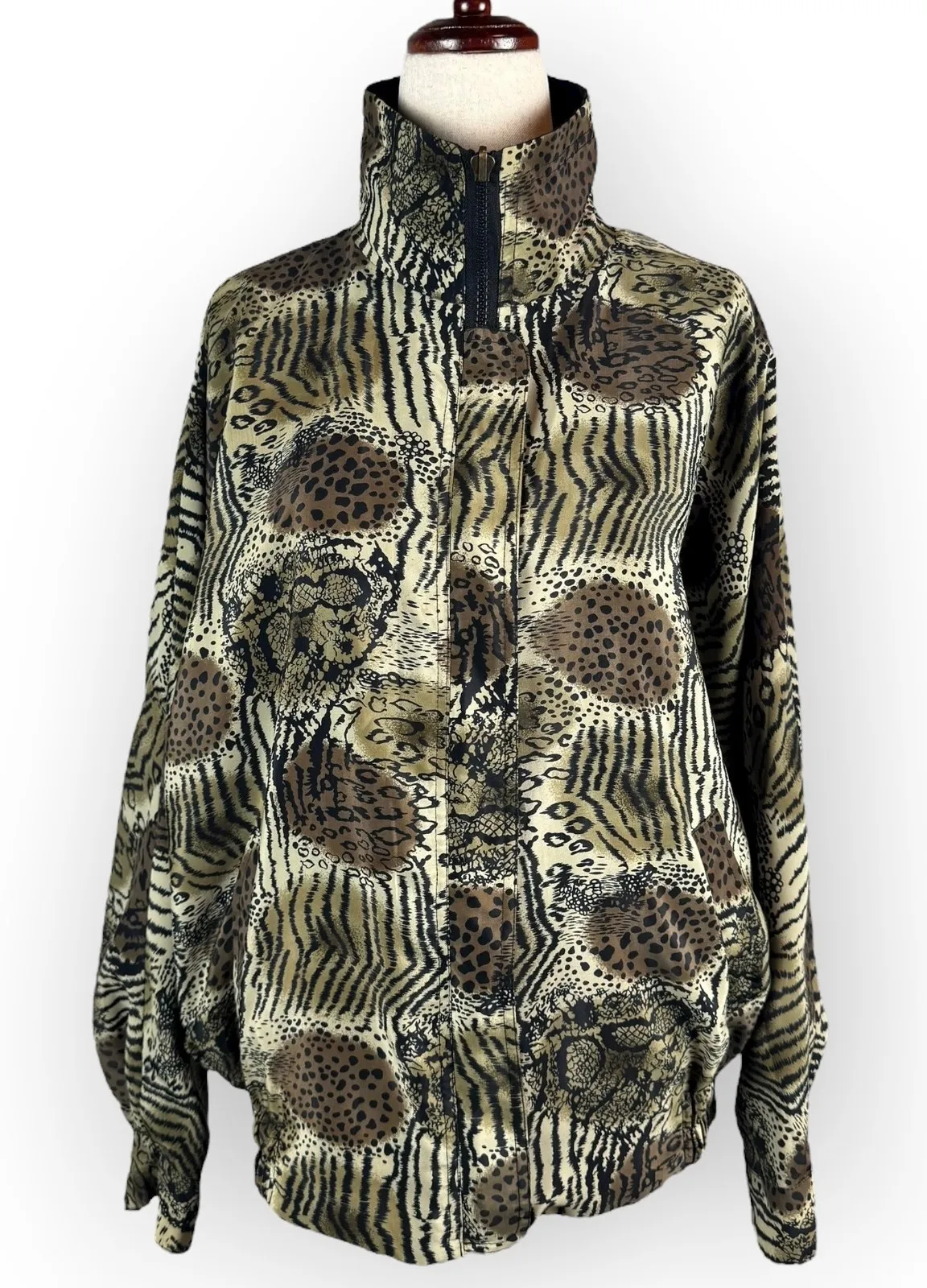 Vintage 1990s reversible animal print jacket featuring a bold mix of tiger and cheetah patterns in b... Show more