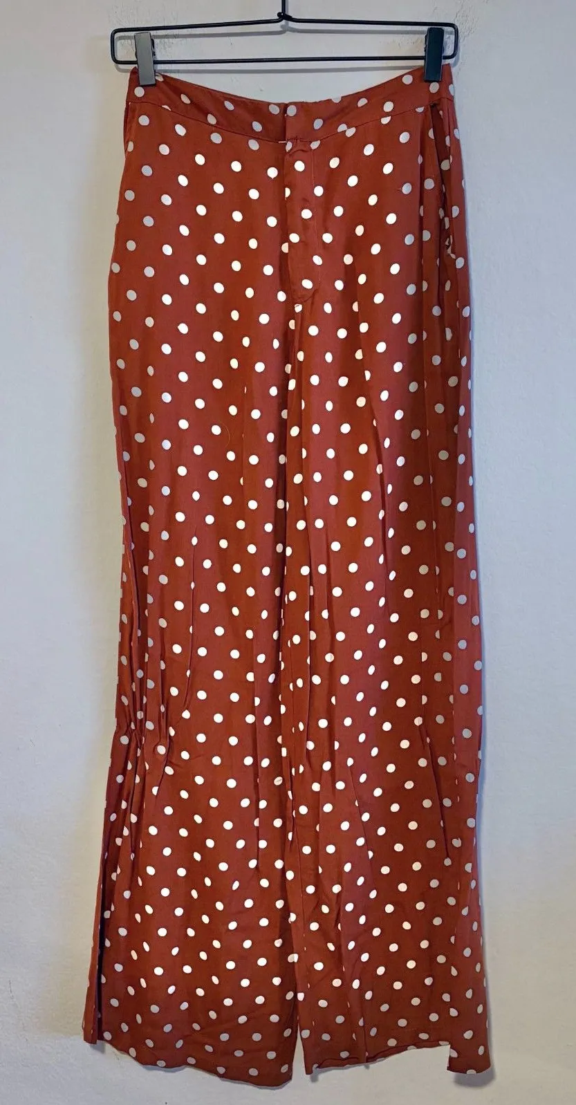 AMICI Burnt Orange White Polka Dot High Waist Flare Wide Leg Pants, originally bought in Spain. Zip and clasp closure. Super lightweight and thin! Size: Small Measurements: 13" waist x 19.5" hips x 11.5" rise x 32.5" inseam Preloved item. Perfect like new condition!
