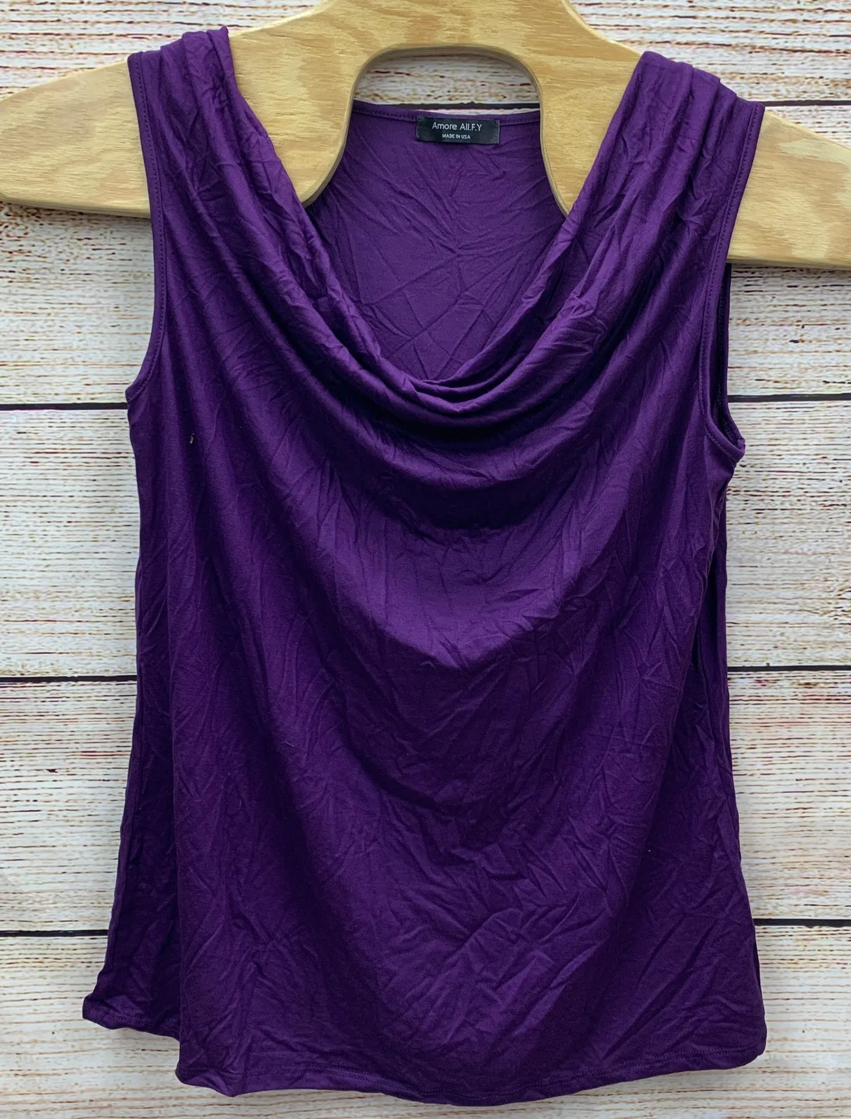A versatile purple sleeveless tank top with a flattering cowl neckline. This top offers a comfortable stretch fit and a stylish ruched detail across the front. Its sleeveless design and relaxed silhouette make it a perfect layering piece or a standalone top for various casual occasions. Type: Tank Department: Women Style: Basic Material: Rayon Blend, Spandex Blend, Rayon, Spandex Neckline: Cowl Neck Sleeve Length: Sleeveless Sleeve Type: Strappy Sleeve Pattern: Solid Accents: Ruffle Theme: USA Features: Stretch, Lightweight Fit: Relaxed Keywords: Amore AllFY top, purple tank top, women's sleeveless shirt, cowl neck top, ruched detail, stretch fabric, plus size fashion, casual top, basic tee, layering piece, Made in USA, ATPSRO004, eggplant color Please look at pictures closely for condition.