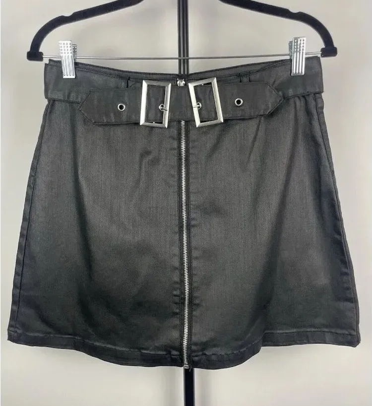 Amp Black Faux Leather Waxed Front Zip Goth Punk Mini Skirt With Belt Size L Excellent used conditi... Show more