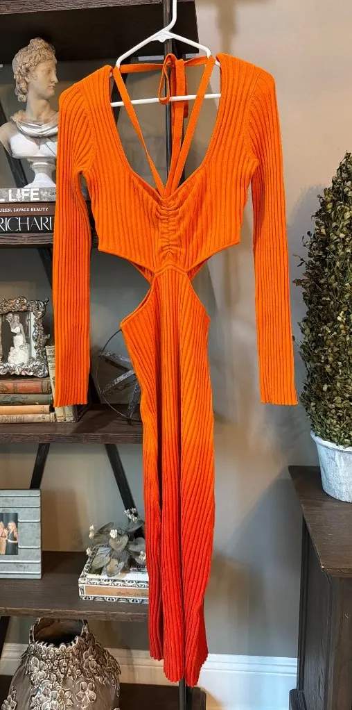 AMUR Araina Dress - Size Small New with tags MSRP: $498 Color: Pumpkin Puree Knit fabrication Halter neck Side cut-outs Ruched bodice Ombre color Tags: revolve, designer, midi, maxi, sweater dress, knit, bodycon, cutout, cut out, cut-out, sexy, stretch, cocktail, party, ombre, dip-dye, tie dye, tie-dye, statement, wedding guest, spring, summer, fall Size: S Condition: New With Tags