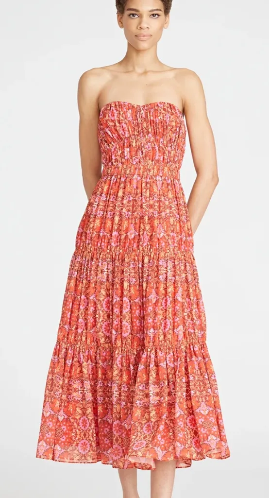 Amur Multicolor Floral Mariana Strapless Cocktail Party Tiered Midi Dress sz 4 Excellent condition Note: please refer to seller photos for actual color of dress Framed by a sweetheart neckline, the Mariana dress features a gathered bodice accompanied by a flowy tiered skirt. Crafted with Eco-Vera and chiffon fabrics, this sustainable style flaunts a lightweight feel—while showcasing a beautiful assortment of lush florals. Zipper opening Sweetheart neckline Strapless Midi length Lined ' 100% recycled polyester Professional dry clean only Approx measurements, flatlay: Pit to pit 15.5" Waist 13" Length 41.5" Please allow 1-2 business days for shipping Smoke-free home Dog-friendly home 927 english countryside, garden party, cocktail, party, graduation, wedding guest, bridal, floral, boho, bohemian, elegant, chic, feminine, romantic, 70s inspired, eco friendly, sustainable, engagement, hamptons, birthday, valentines day, formal, special occasion, holiday