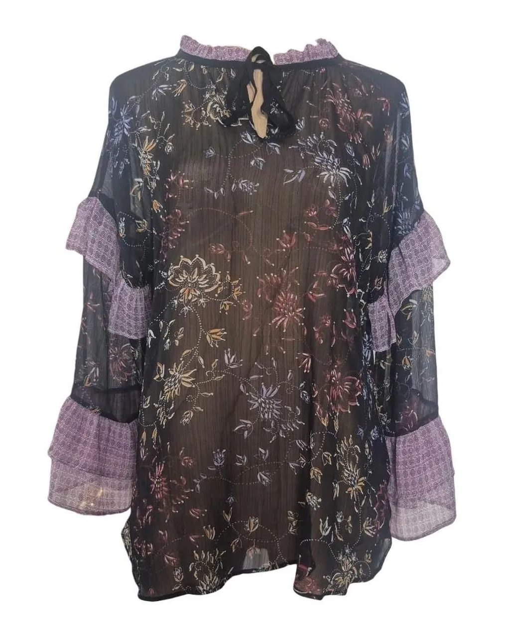 A New Approach Black Sheer Floral Blouse Ruffle Sleeves Size Small Condition: Excellent pre-owned... Show more