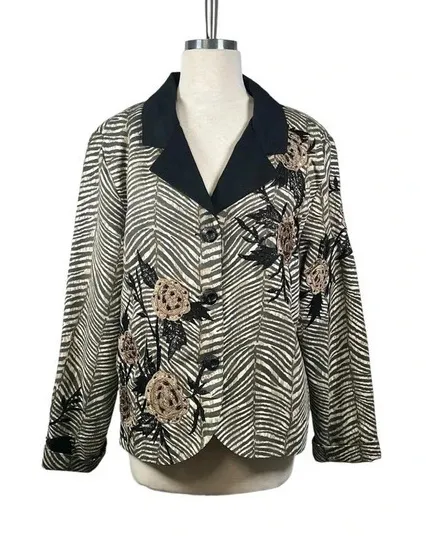 All orders ship next business day! Vintage ANAGE Blazer, "Small Art to Wear", animal print with floral beading and embroidery, black collar and buttons, button down jacket, lined, built in shoulder pads, women's size XL. Condition: clean, excellent condition Color: black, white, tan Size: XL, Length- 25", Pit to Pit- 24" (approximate) Material: polyester embroidery, boho, bohemian, southwestern, floral, flowers, beaded, beading, maximalist, jacket, blazer, animal print, art, artsy, unique, quirky, fun, event, party Smoke free and pet free home!