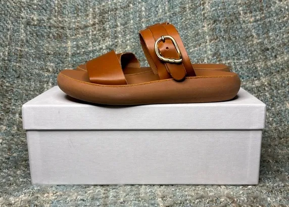 Preveza slip-on sandals from ANCIENT GREEK SANDALS featuring tan calf leather, slip-on style, open toe, decorative buckle detailing, branded footbed and flat rubber sole. Composition Lining: Calf Leather 100% Outer: Calf Leather 100% Sole: Rubber 100% New in box EU 35 / US 5