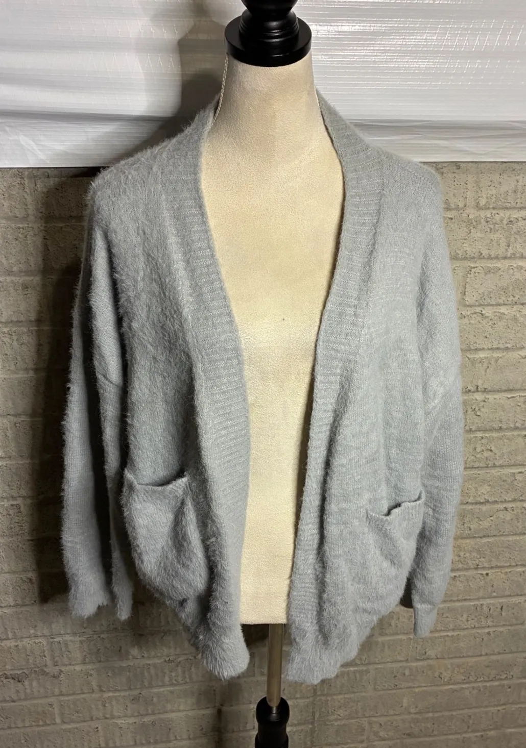Wrap yourself in cloud-like comfort with this sumptuously soft fuzzy knit cardigan. Its plush texture invites you to snuggle in, while the relaxed open-front design drapes effortlessly for a chic and cozy silhouette. Two convenient pockets offer a place to warm your hands or stash small essentials, making this your go-to layer for ultimate relaxation and effortless style. Perfect for curling up with a good book on a lazy Sunday morning, adding an extra layer of warmth for a casual coffee date, or creating a comfortable yet put-together look for running errands. Style: Cardigan Department: Women Material: Polyamide, Acrylic Blend Type: Sweater Sleeve Length: Long Sleeve Features: Pockets, Open, Oversized Pattern: Solid Fabric Type: Knit Keywords: gray cardigan, fuzzy sweater, knit cardigan, women's cardigan, cozy sweater, soft knit, open front cardigan, lounge sweater, casual sweater, oversized cardigan, plus size cardigan, fall fashion, winter fashion, everyday wear