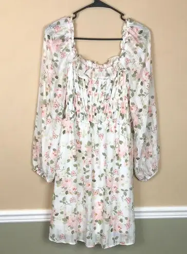 Excellent condition. 100% Polyester. White with pink, green, yellow, and orange floral print. Smocked upper front and back. Ruffle detail around smocked neckline and upper back. Slightly sheer sleeves. Lined. Approximate measurements: Pit to pit - 20” Shoulder to bottom hem - 36.75”