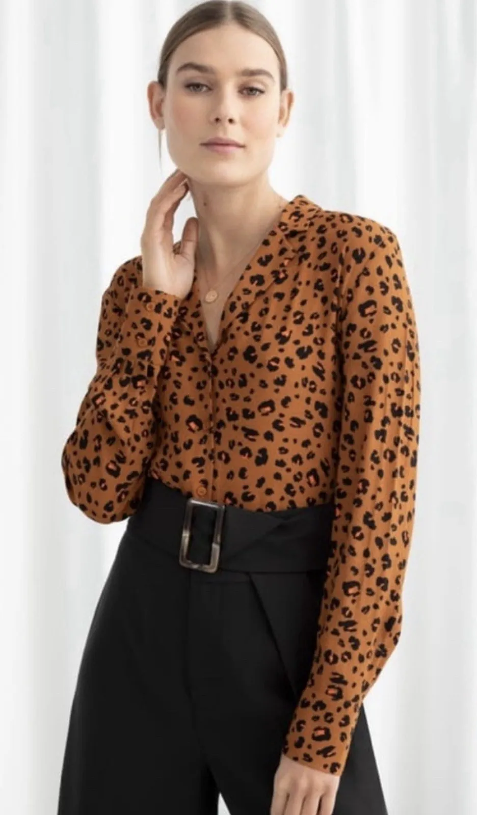 & Other Stories Paris Atelier Women’s Size 6 Brown Black and Orange Leopard Print Blouse Long Sl... Show more