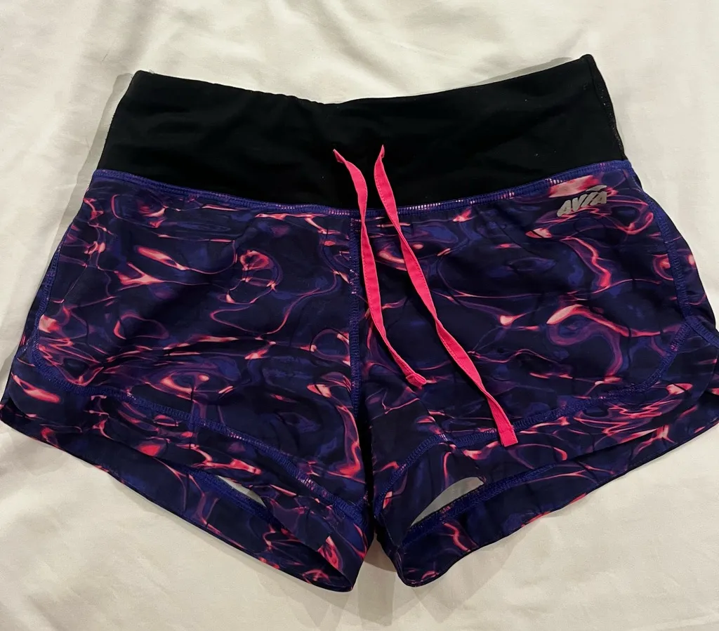 Dynamic design with a black waistband. Purple and pink swirl pattern. Ideal for active wear.