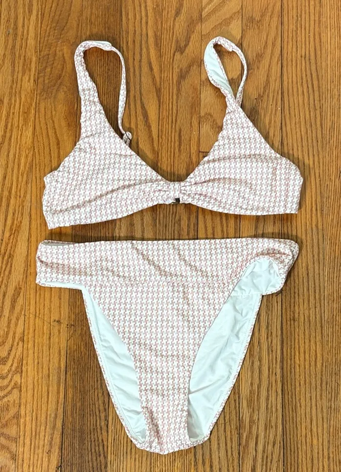 New without tag- both pieces have the sewn in brand tag. The material/size tag wasn’t printed Hygiene liner torn Missing removable bust pads Take the plunge without the risk with the brand-new Amor Top. The deep v-neckline still features medium support and a back closure you can count on. Knot front deep V top Wide, supportive, & adjustable straps Back hook Compression medium Support medium The Wide Band Cheeky Bikini Bottom rise hits below the belly button compressive fabric for sculpting comfort Cheeky bottom coverage High leg cut Beach beachwear spring break swimsuit bathing suit bikini set summer vacation swimwear tropical vacation preppy minimalist classic