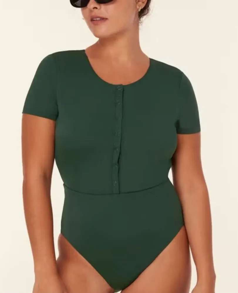 Cover picture is the color of the suit. From the Wild Beauty Collection. The Augusta swimsuit is a snap-front piece, showcasing a modern yet classic silhouette with a scoopneck, short sleeves, and full bottom coverage. Scoopneck Short sleeves Medium bust support Full coverage Snap placket 80% nylon/20% elastane Hand wash Beach beachwear spring break one piece swimsuit bathing suit summer vacation swimwear tropical vacation classic minimalist cutout