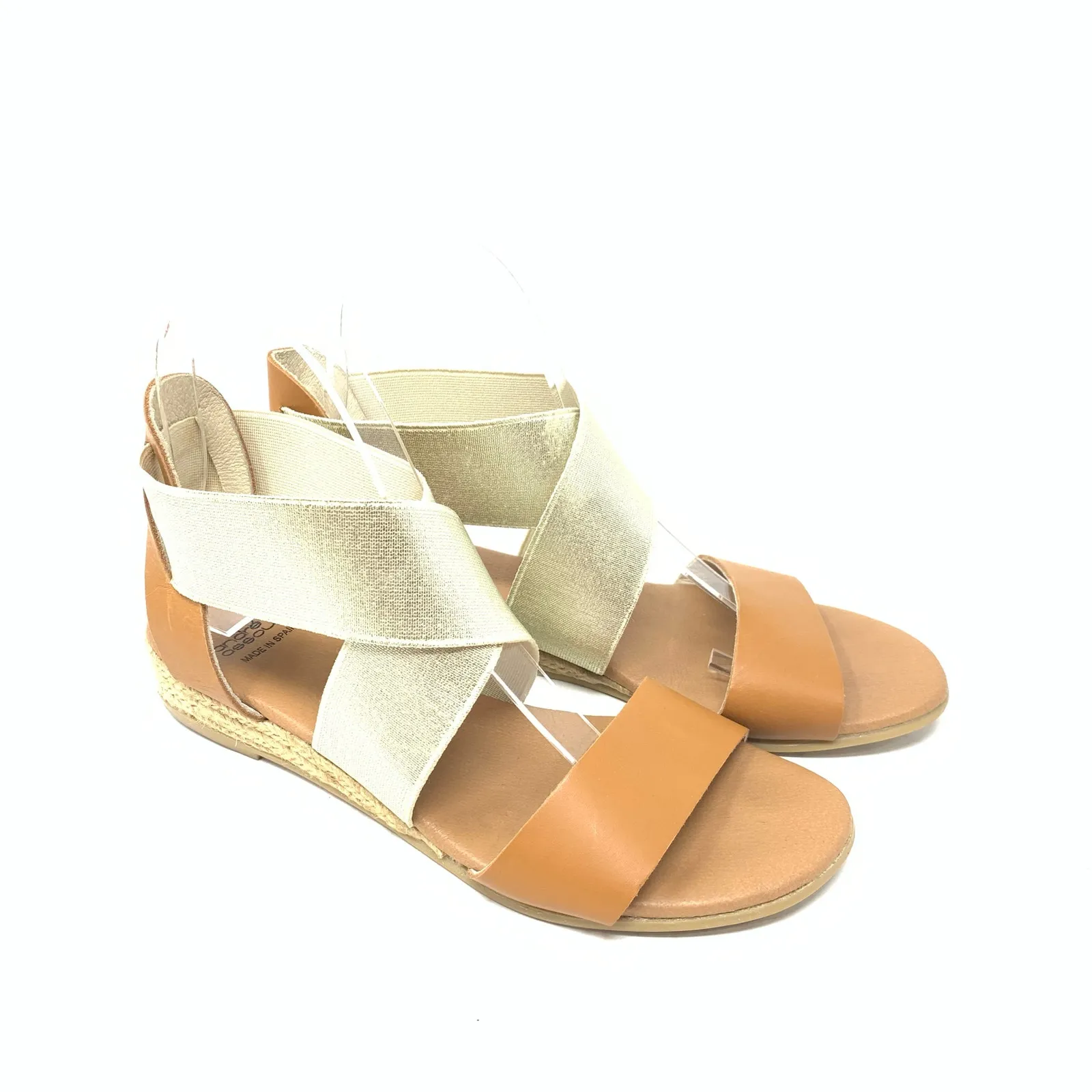 Andre Assous Leather Metallic Gold Wedge Espadrille Sandal Strappy Size 37. Good pre-owned condition with minor imperfections consistent with normal wear, so please see all photos. Made in Spain.