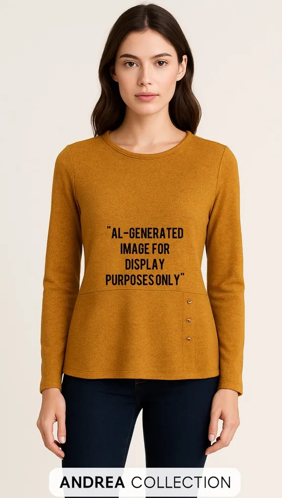 Stylish Andrea Collection women’s blouse. • Estimated size: Small–Medium (check measurements) • Color: Mustard yellow • Long sleeve • Round neckline • Decorative side buttons • Fabric: Soft knit blend • Condition: Pre-owned, excellent