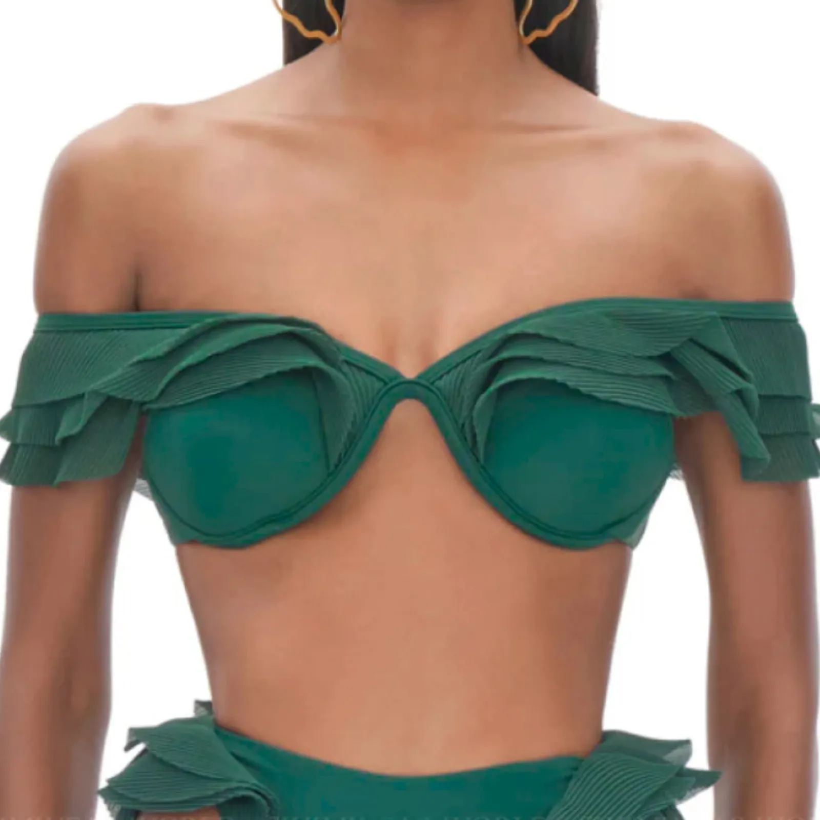 Andrea Iyamah Salama Bikini Top. New with imperfections, couple tiny snags & small flaw in ruffle (see photo 8) Elevate your resort look with this bikini top by Andrea Iyamah, featuring underwire support, a flattering deep-emerald hue, and an adjustable shoulder strap that can be worn multiple ways. A statement swim piece that exudes confidence and sophistication, perfect for tropical getaways or luxe poolside lounging. DETAILS: • Size: Large • Color: Deep Emerald Green • Material: 80% nylon, 20% elastane • Features: Pleated halter neckline, tiered ruffles, W underwire cups, clasp closure, lined cups, structured fit, adjustable strap, convertible KEYWORDS: women’s, swim, swimsuit, halter, structured, resort, vacation, tropical, designer, luxury, poolside, elegant, statement, boho, glam, chic, avant garde, mermaidcore, beach Please note that product color may slightly vary due to lighting or monitor settings. Always open to offers & happy to answer any questions you have! (583)