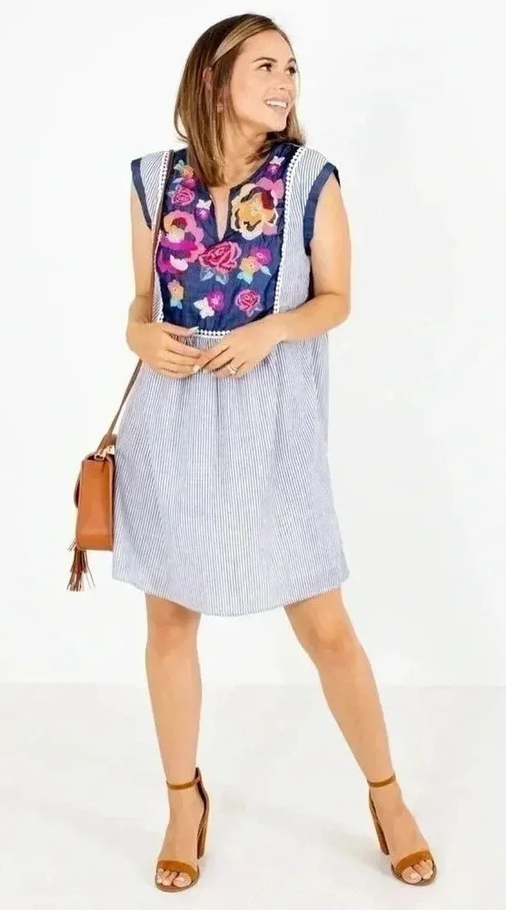 Down to Georgia Blue Striped Mini Dress Size small excellent new condition Comfortable, Relaxed Fit High-Quality, Lightweight Blue with Multicolored Accents Striped Pattern, Embroidered Detailing 100% Rayon; 100% Tencel Contrast; 100% Rayon Lining Say hello to summer in our new Down to Georgia Blue Striped Mini Dress! This mini dress features a blue and white striped pattern. We're obsessed with the multicolored floral embroidery on the bodice! The high-quality, lightweight material makes this dress perfect for wearing on a sunny day. The interior lining adds the perfect finishing touch! Pair our Down to Georgia Blue Striped Mini Dress with sandals. Our Down to Georgia Blue Striped Mini Dress is composed of 100% Rayon; 100% Tencel Contrast; 100% Rayon Lining. Hand wash cold. Hang or lay flat to dry. Please do not bleach. Size small, fitting true to size button closure on the back with a small keyhole I am 5’4 and this dress hits me about 4 inches above the knee