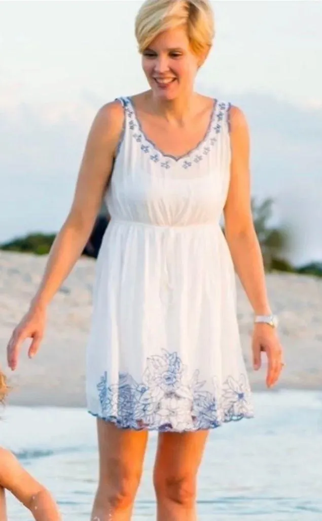 Gorgeous Andree blue and white sundress with embroidered floral details at hem and neckline. Worn on... Show more