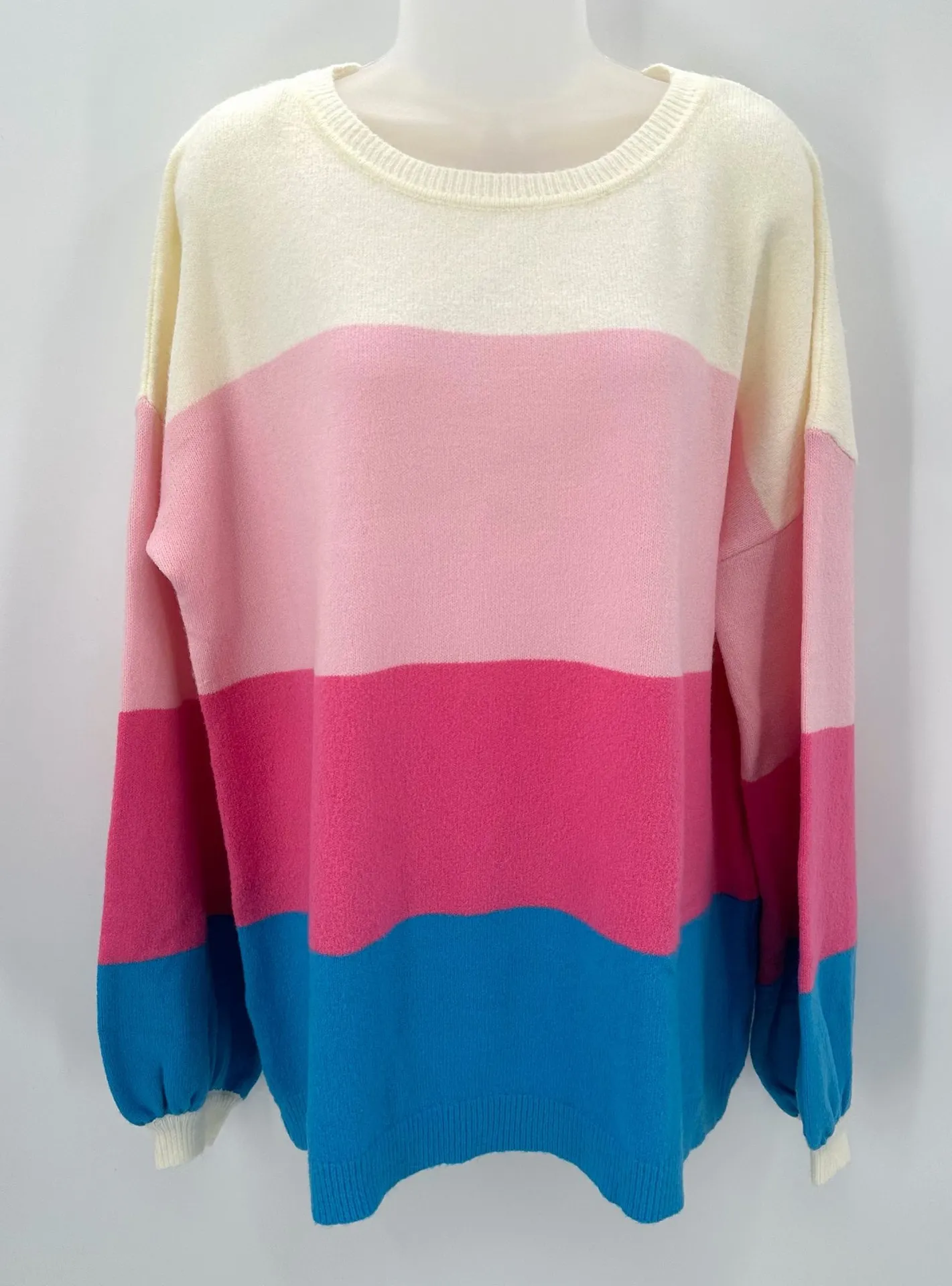 Andree By Unit Sweater Women’s 2X Plus Blue Pink Knit Balloon Slv Love This Life "Love this Life" sweater from Andree by Unit in size 2X Womens Plus. Colorblock stripe in hues of pink, bright blue, and cream. Long balloon sleeves in an acrylic blend knit. Pullover entry. Original tags attached; unworn. Retail $46.95. *There is a manufacturing irregularity in the knit on one sleeve; noted in photos. See photos for details and approximate flat lay measurements to determine fit.