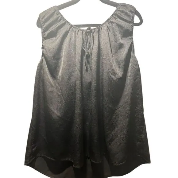 This women's tank in size 2XL is a basic style top, perfect for casual summer occasions. It features a solid black color with a ruched design and a tie neckline. Made from soft satiny type comfortable fabric, this sleeveless tank offers a regular fit. The item is pre-owned. Keywords: Semantiks, women's tank, 2XL, black, sleeveless, tie neckline, ruched, casual, summer, pre-owned, basic style, solid color, comfortable fabric, regular fit, soft fabric. Brand: Semantiks Size: 2XL Color: Black Type: Tank Department: Women Style: Basic Material: Soft and comfortable fabric Neckline: Tie Sleeve length: Sleeveless Pattern: Solid Features: Ruched, Tie Neckline Fit: Regular Occasion: Casual Season: Summer