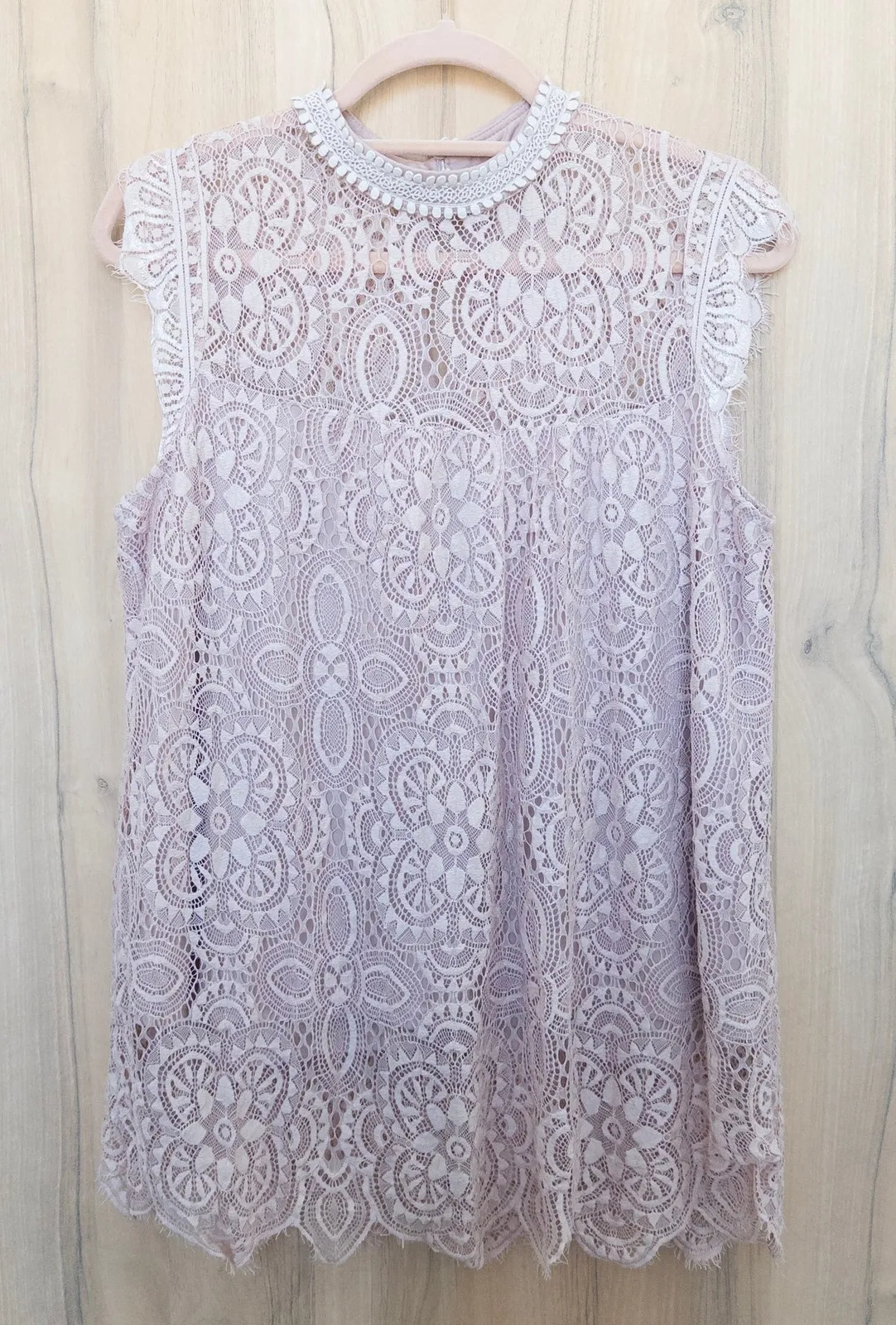 A lilac lace mock neck mini dress with a sleeveless design. This charming dress showcases an intricate all-over lace pattern with a delicate scalloped hem and ruffled sleeve edges. A keyhole detail at the back adds a touch of allure. Perfect for garden parties, date nights, or a stylish brunch. Style: boho, lace, romantic, coquette, floral, whimsical Approximate Measurements (taken flat lay): Length: 29" Pit to Pit: 19" Excellent condition. No visible flaws. See all photos for details. Ships next business day. Bundle deals available. Smoke-free home. Please check measurements before purchasing. SKU: 3857
