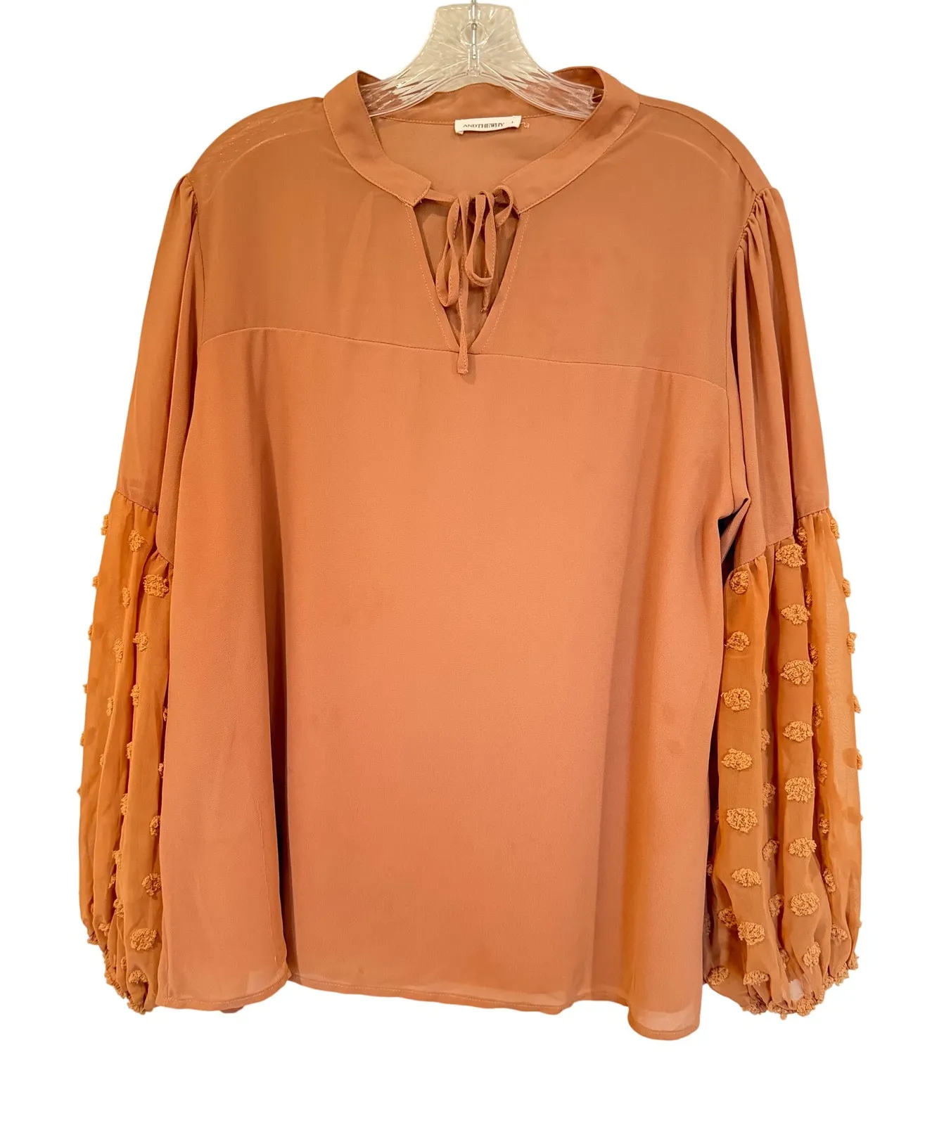 . Elevate your style with this beautiful ANDTHEWHY blouse, a captivating piece designed to make a statement. The rich tan/brown hue emanates warmth and sophistication, while the unique swiss dot balloon sleeves add a touch of whimsical charm and volume. A delicate tie-neck detail offers a customizable neckline, allowing you to adjust for your desired look. Excellent, pre-owned condition. Ships from a non-smoking home. Measurements: • PTP: 22" • Sleeve length: 23" • Length: 26" Material: 100% Polyester Neckline: High Neck Sleeve Length: Long Sleeve Sleeve Type: Balloon Sleeve Pattern: Solid Features: Sheer, Keyhole Neck Fit: Relaxed Fabric Type: Chiffon Occasion: Casual, Party/Cocktail Closure: Tie Keywords: ANDTHEWHY blouse, tan top, textured sleeves, balloon sleeves, tie neck, bohemian, chic, feminine, day to night, elegant, statement sleeve, fall fashion, spring style, everyday wear