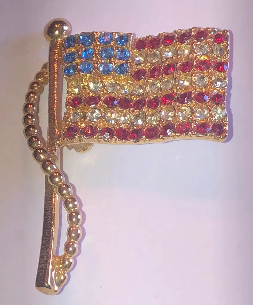 Elegant brooch featuring red, blue, and clear crystals in an American flag design. Perfect for adding a patriotic touch to any outfit. New without tags. Signed Angel brand Approximately 1.5” x 2” S8 Boho Vintage Street Style Minimalist Statement Piece Essential Trendy Fashion Forward Must-Have On-Trend Cute Casual Edgy Classic Rare Find retro mid century modern estate jewelry costume jewelry