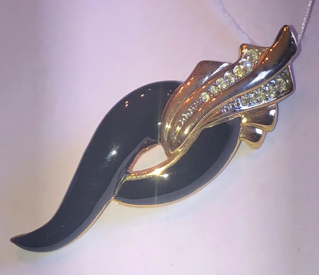 Enhance your style with this sophisticated black and gold tone brooch. Its elegant design is perfect for any occasion, adding a touch of glamour to your outfit. New with Angel brand tags. Signed Angel brand Approximately 3/4” x 2.25” S24 Boho Vintage Street Style Minimalist Statement Piece Essential Trendy Fashion Forward Must-Have On-Trend Cute Casual Edgy Classic Rare Find retro mid century modern estate jewelry costume jewelry
