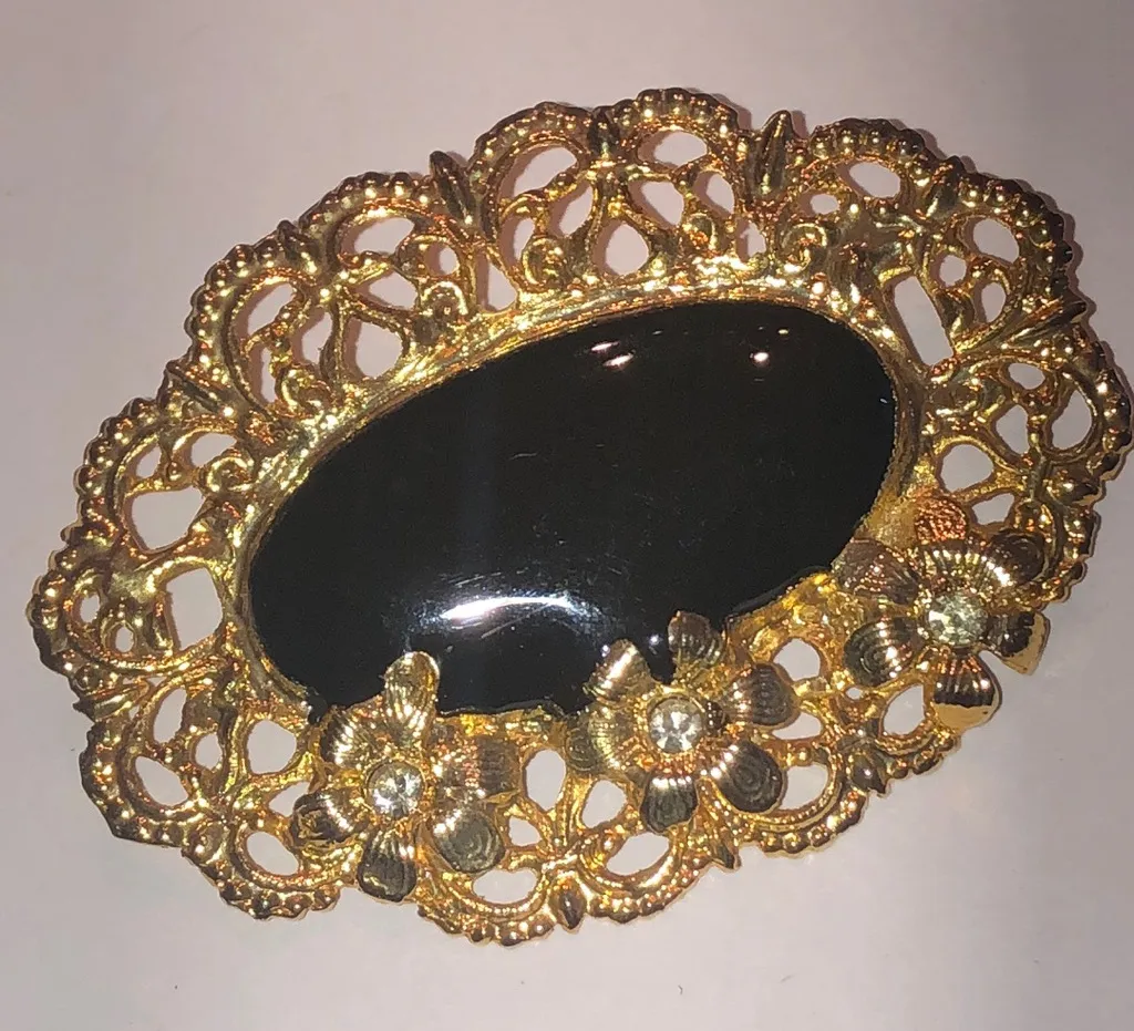 This exquisite brooch features a stunning black centerpiece surrounded by intricate gold tone detail... Show more