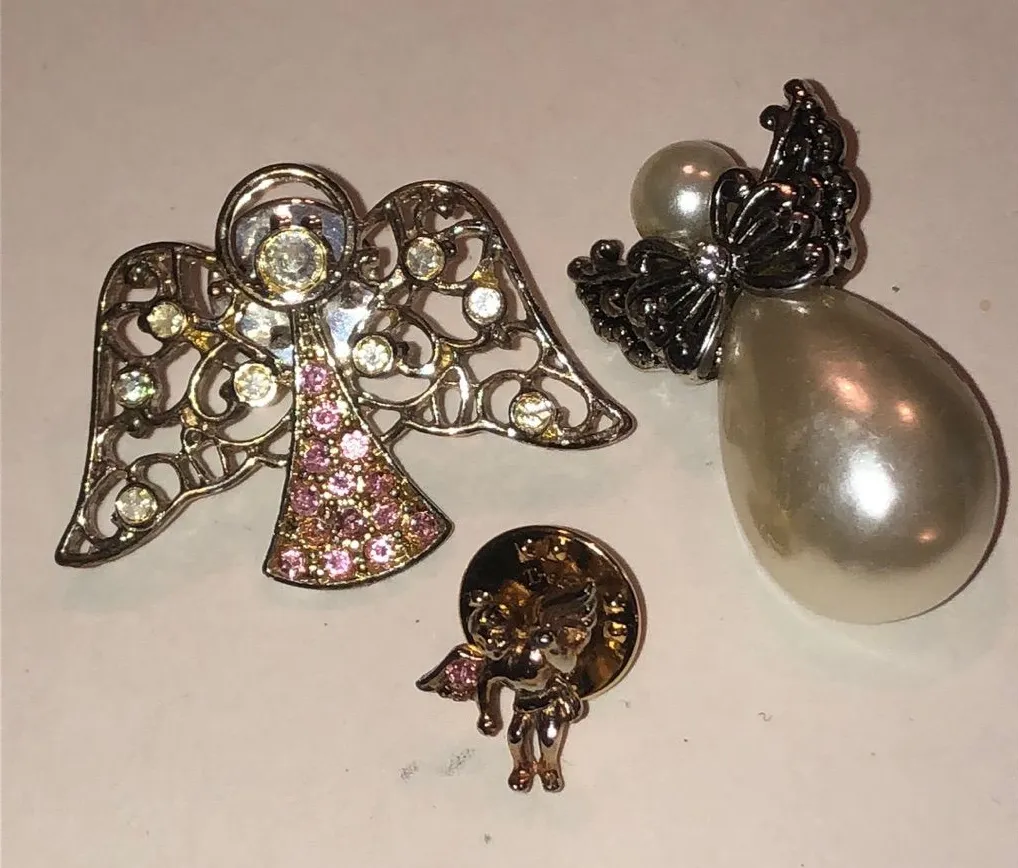 Elegant angel-themed brooch and pin set. Features intricate designs with pearl and pink accents. Good condition with wear on pink and silver tone Angel pink as shown Approximately 1/2”-1.75” S5 Boho Vintage Street Style Minimalist Statement Piece Essential Trendy Fashion Forward Must-Have On-Trend Cute Casual Edgy Classic Rare Find retro mid century modern estate jewelry costume jewelry