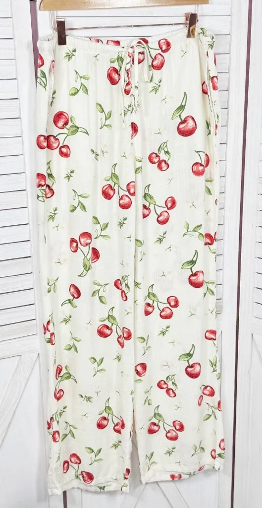 Angel Kiss Cherries Print Linen Blend Wide Leg Palazzo Pants Cream Red Size Large Cream with red... Show more