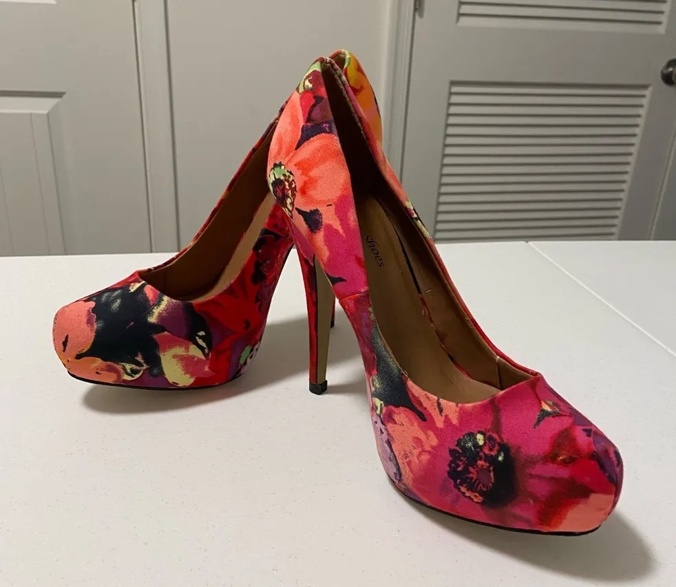Women’s floral Fiona pumps by Angeles Shoes. Shoes are a scheme of red & pink florals. Size 7. Excellent condition, but sole of shoe has a mark from sticker removal—rest of shoe has no flaws. Smoke free home!
