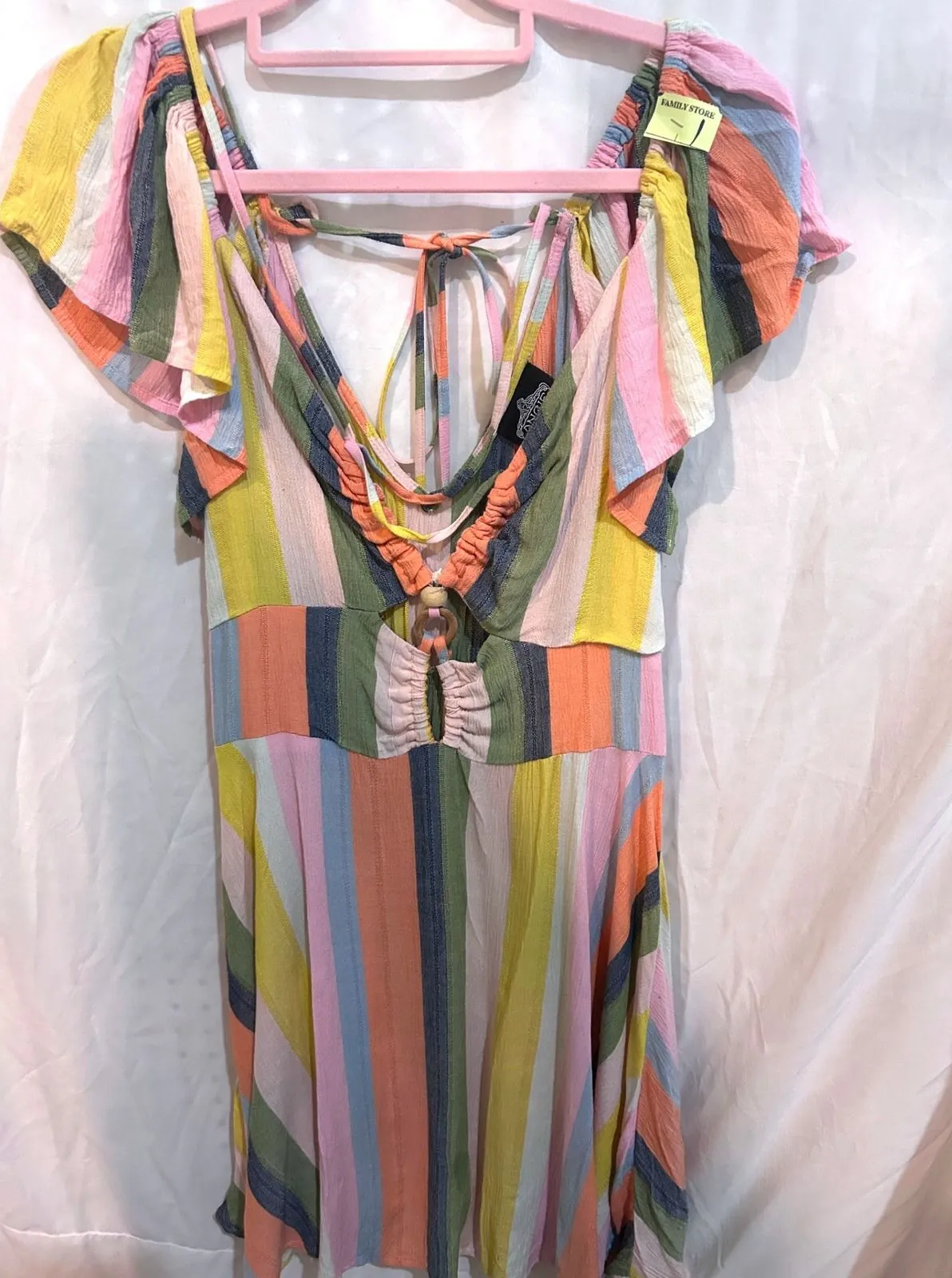 ANGIE striped dress with flutter sleeves and a charming keyhole cutout detail. The V-neckline is enhanced with a tie closure and ruffled trim, while the empire waist cinches for a flattering silhouette. This vibrant dress is perfect for a beach day or a casual vacation getaway.