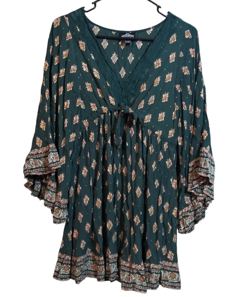 Angie Teal and Beige Patterned Bell Sleeve Boho Mini Dress Size Small Chic teal dress with beige p... Show more
