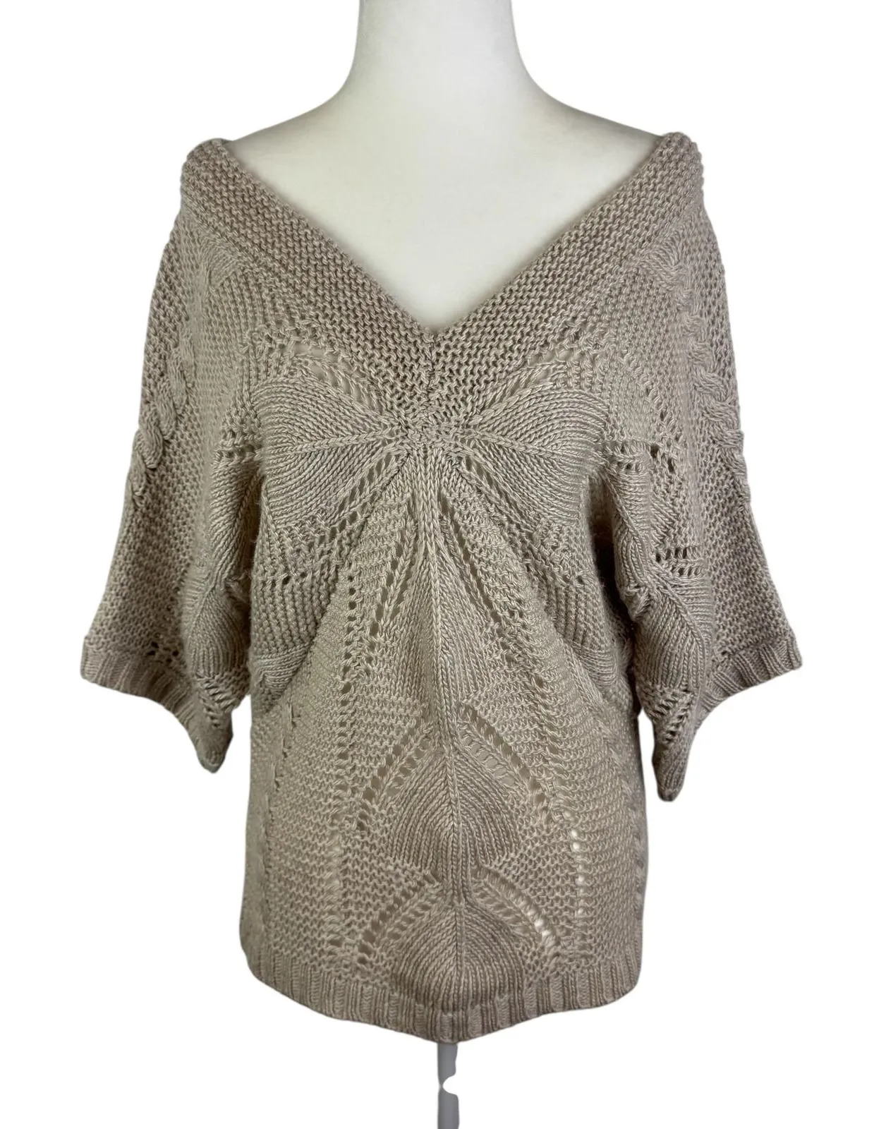 Elegant knit sweater featuring a flattering V-neck design and stylish batwing sleeves. This lightwei... Show more