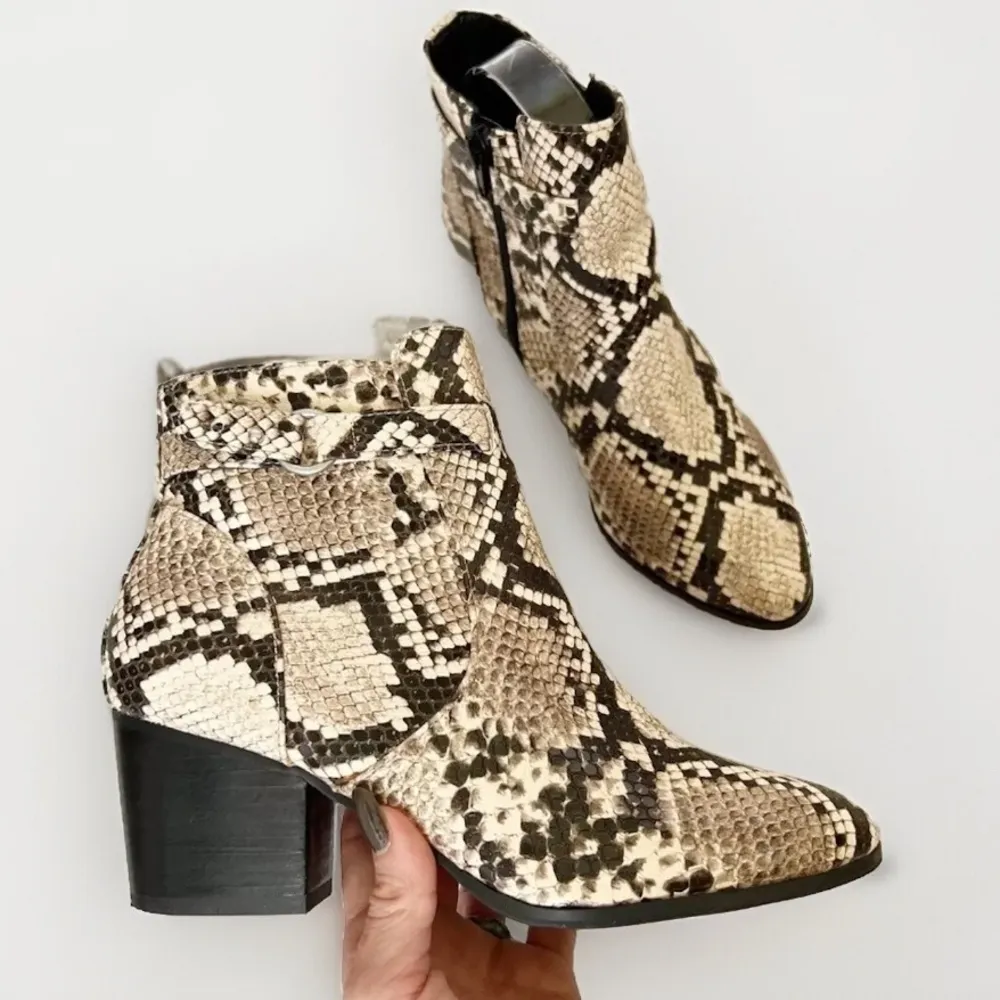 NEW without box! From NORDSTROM store, MARKET & SPRUCE boho bohemian Snakeskin Print Black Beige Block Heel ankle Boots booties size 6.5 Market and Spruce Snakeskin animal print and pointed toe, low stacked heel ankle boots. Side zipper closure. 2” inch block heel Tags: luxury ladies celebrity romantic woman’s summer fall spring winter all season shirts & blouses jersey tops day going out shirts white elegant beach surf accessories dress groovy ugly funny granny style sweaters plaid sleeves cardigan pair with sweater prom funeral mat