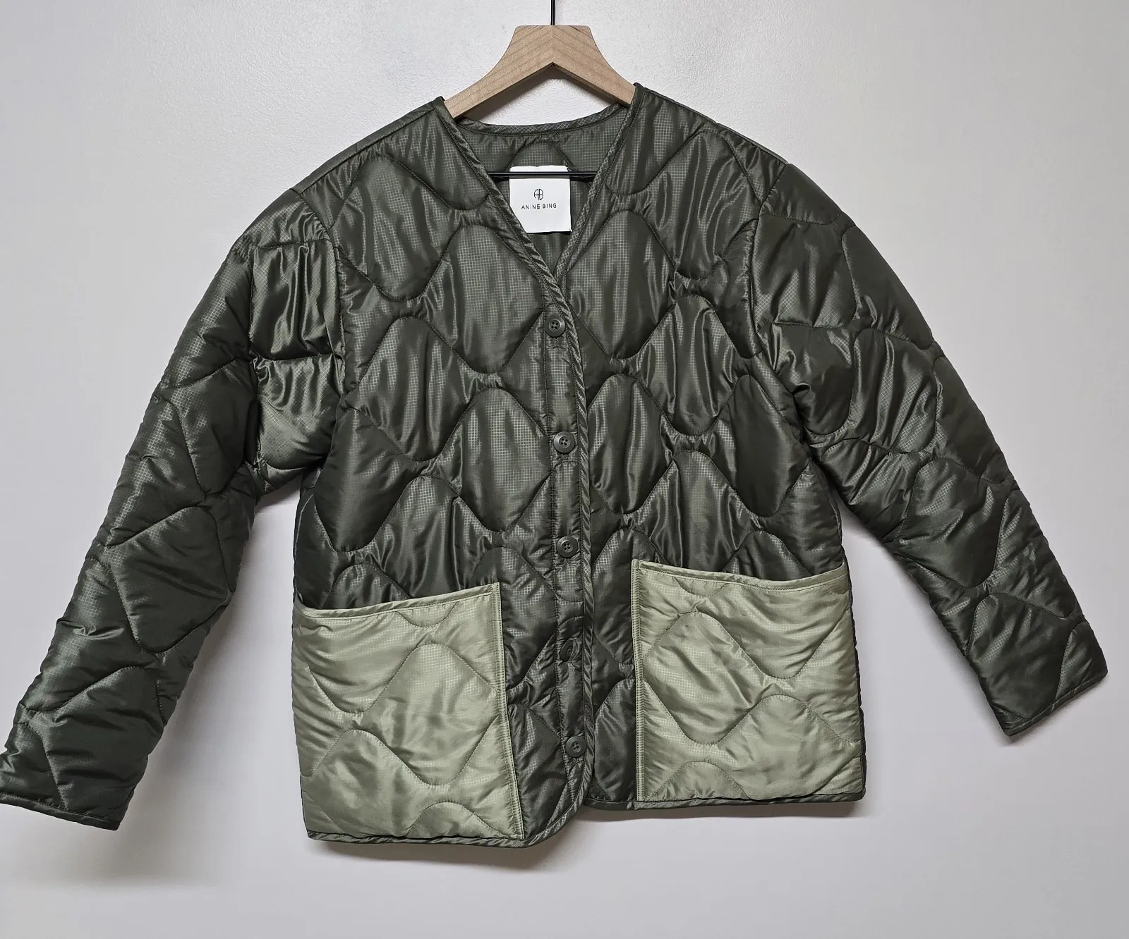 Oversized, relaxed fit. There are a couple very small spots that haven't been treated, so may come out. The Anine Bing Women's Andy Quilted Bomber Jacket in military green is a stylish and edgy outerwear piece perfect for the fashion-forward woman. Made from durable polyester, this jacket features a classic bomber style with a unique quilted design, giving it a designer and bohemian-inspired look. The size small fits regular, making it a versatile addition to any wardrobe. Whether you're going for a trendy army-inspired vibe or simply looking for a standout piece to add to your collection, this jacket is sure to make a statement.