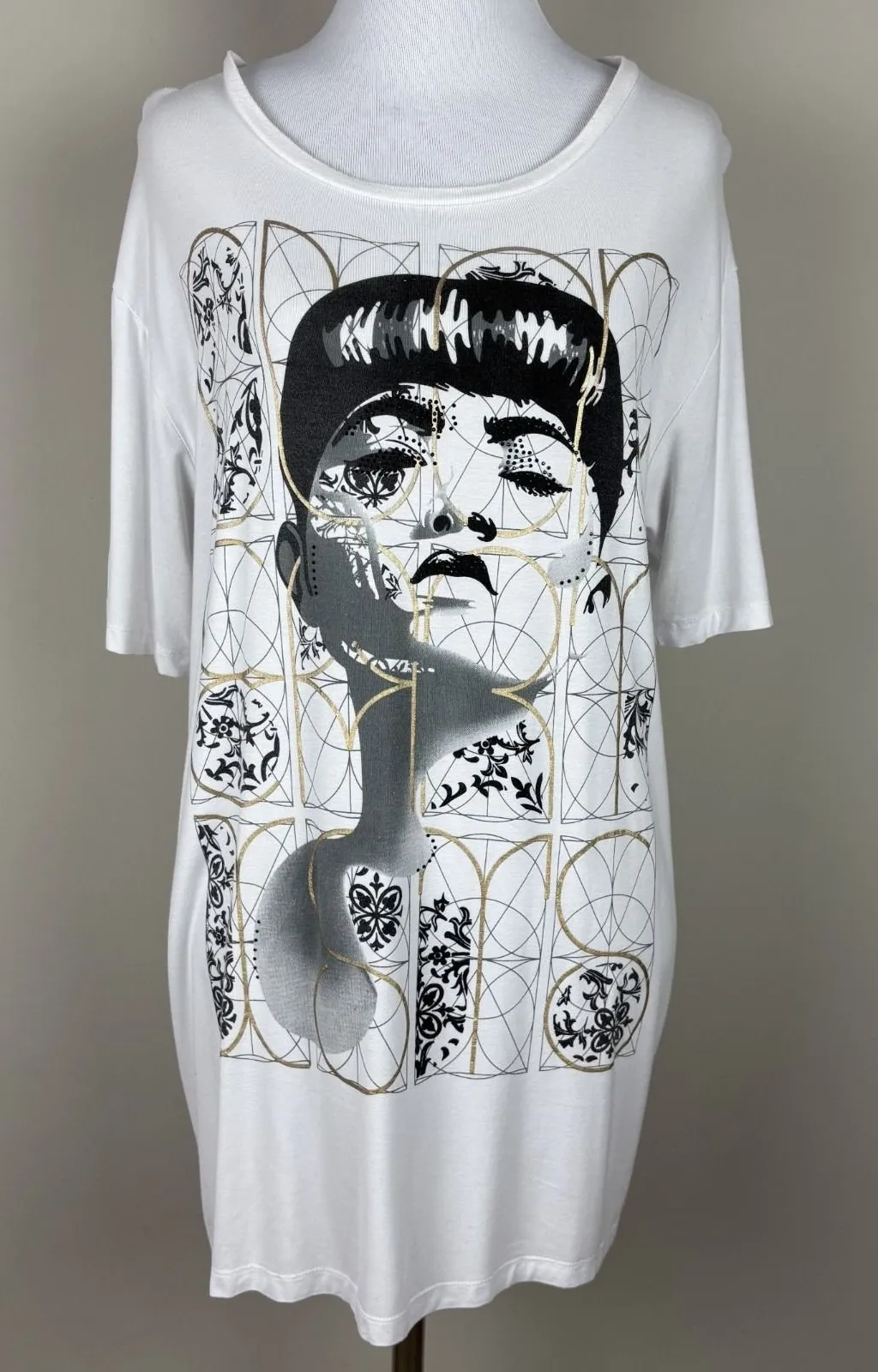 ANN DEMEULEMEESTER T-Shirt Womens XL White Woman Portrait 100% Cotton Designer Good condition! The white is not bright white. Light fabric wear throughout. There are probably a few missing rhinestone beaded accents. Measurements are in the photos. Fabric content and washing / care information in photos - see tag photos. Pullover Short sleeve Lightweight knit Female photo graphic Rhinestone bead accents on face Casual All preowned items have been cleaned. Stored in a smoke and pet free home. Thanks for looking!