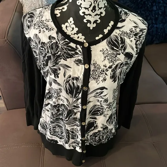 Beautiful ANN TAYLOR Black & White Flower Print 3/4 Sleeve Cardigan Size Large! Very good condition... Show more