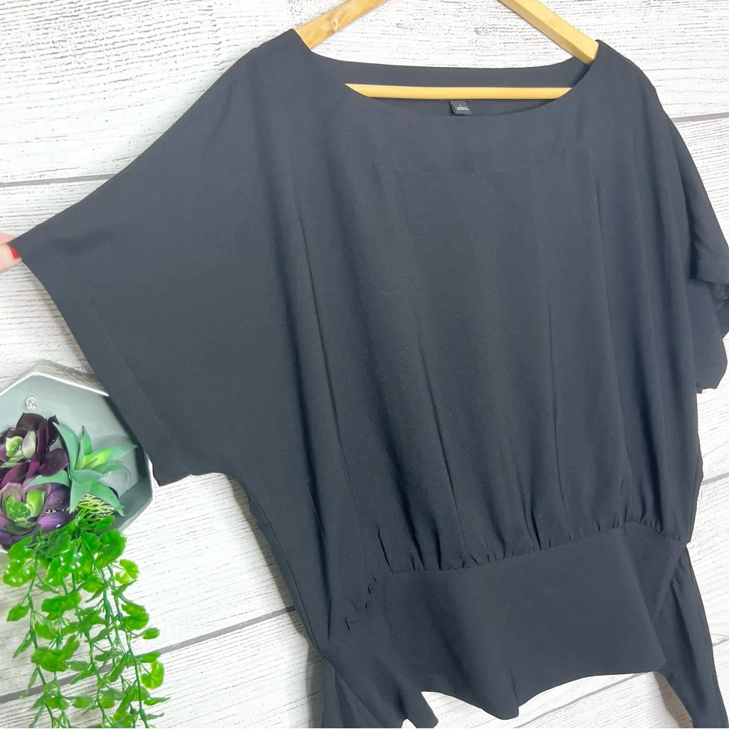 Ann Taylor Black Boatneck Dolman Sleeve Smocked Waist Tie Back Top Women’s Size Large Approximate... Show more