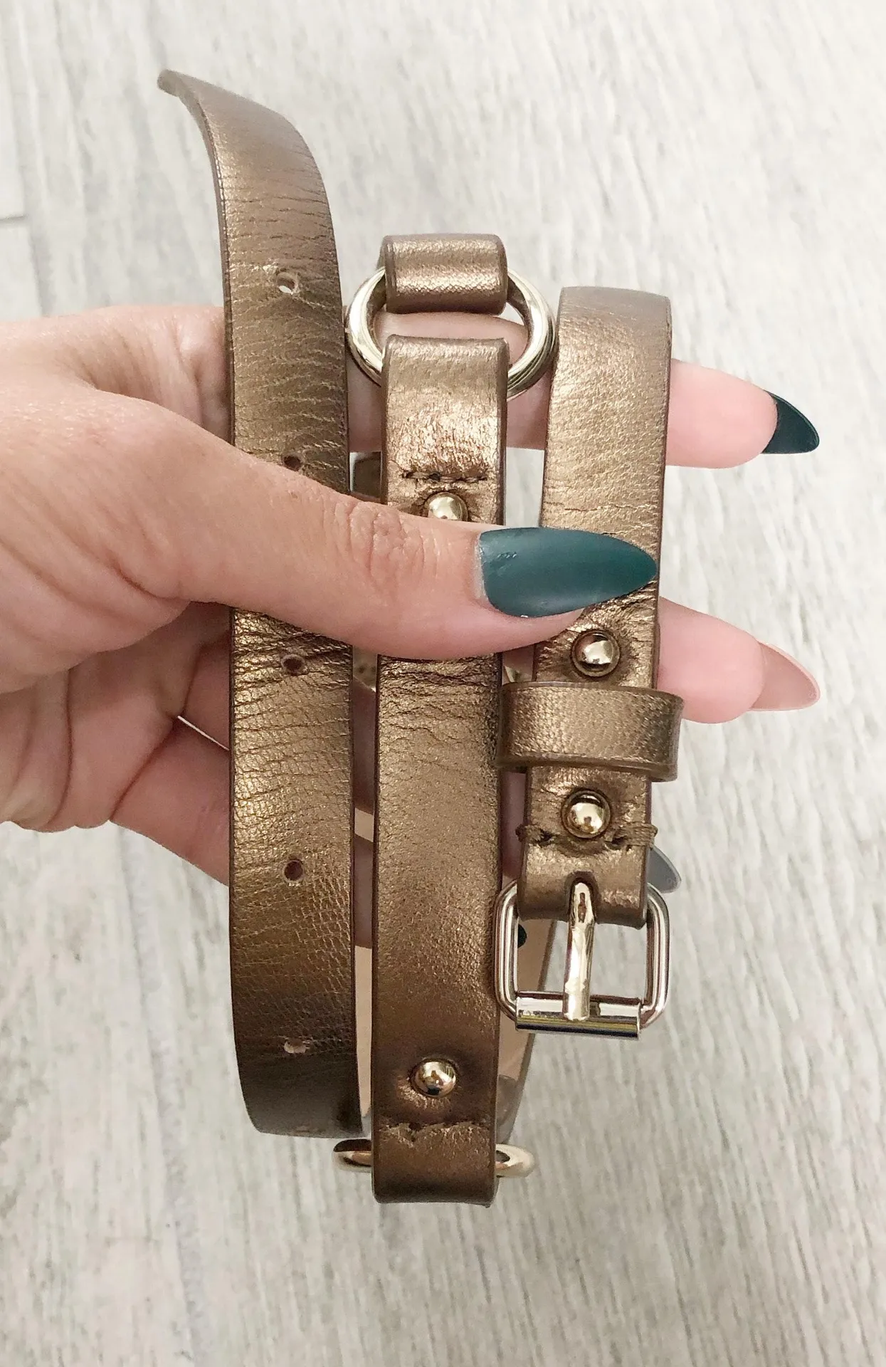 Dark gold color Genuine leather Light gold hardware Minor signs of wear Size small 31.5” from buckl... Show more